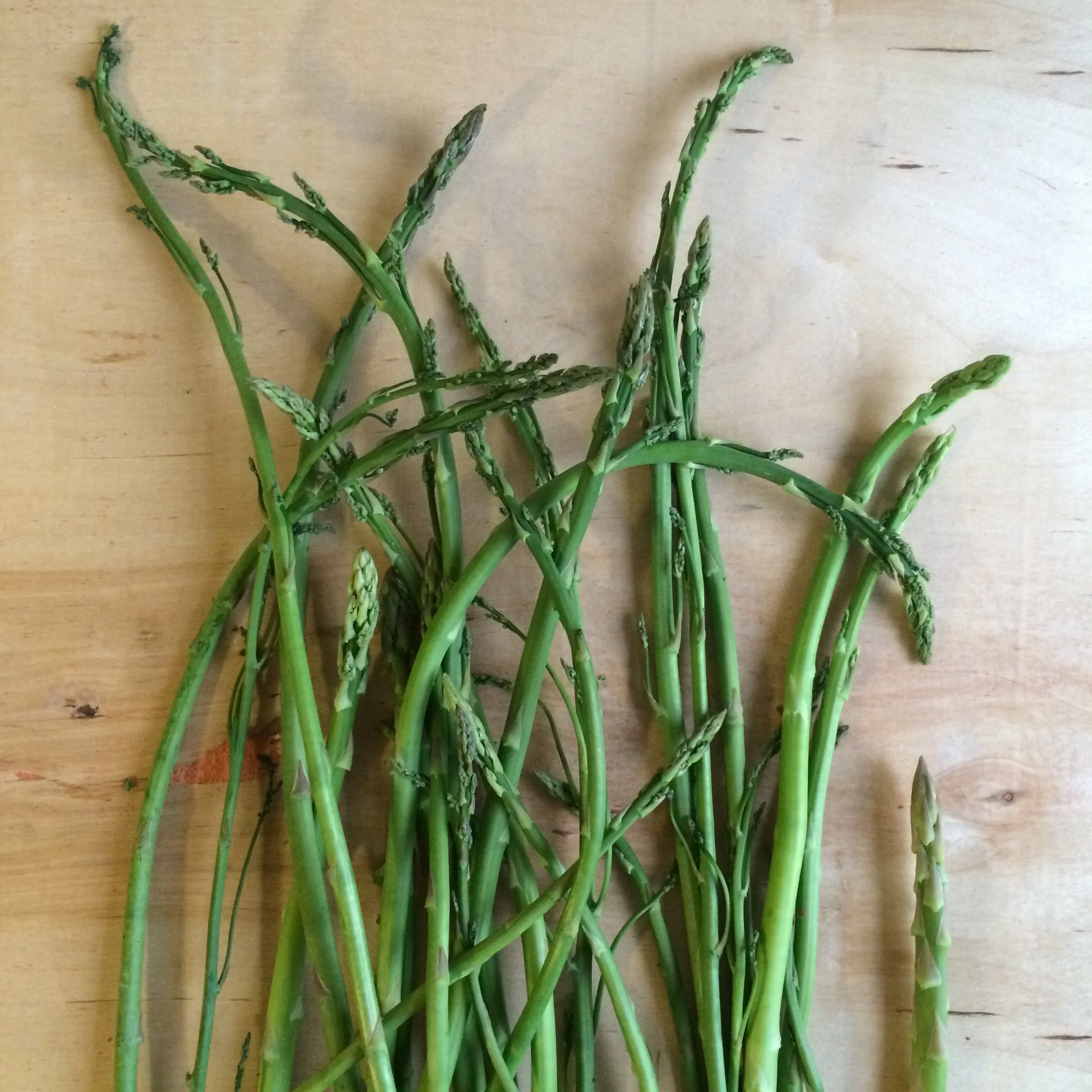 - Snap an end off of one asparagus spear. The asparagus will naturally break where the soft part meets the tougher stem. Use that spear as a guide to chop the bottoms off the whole bunch.