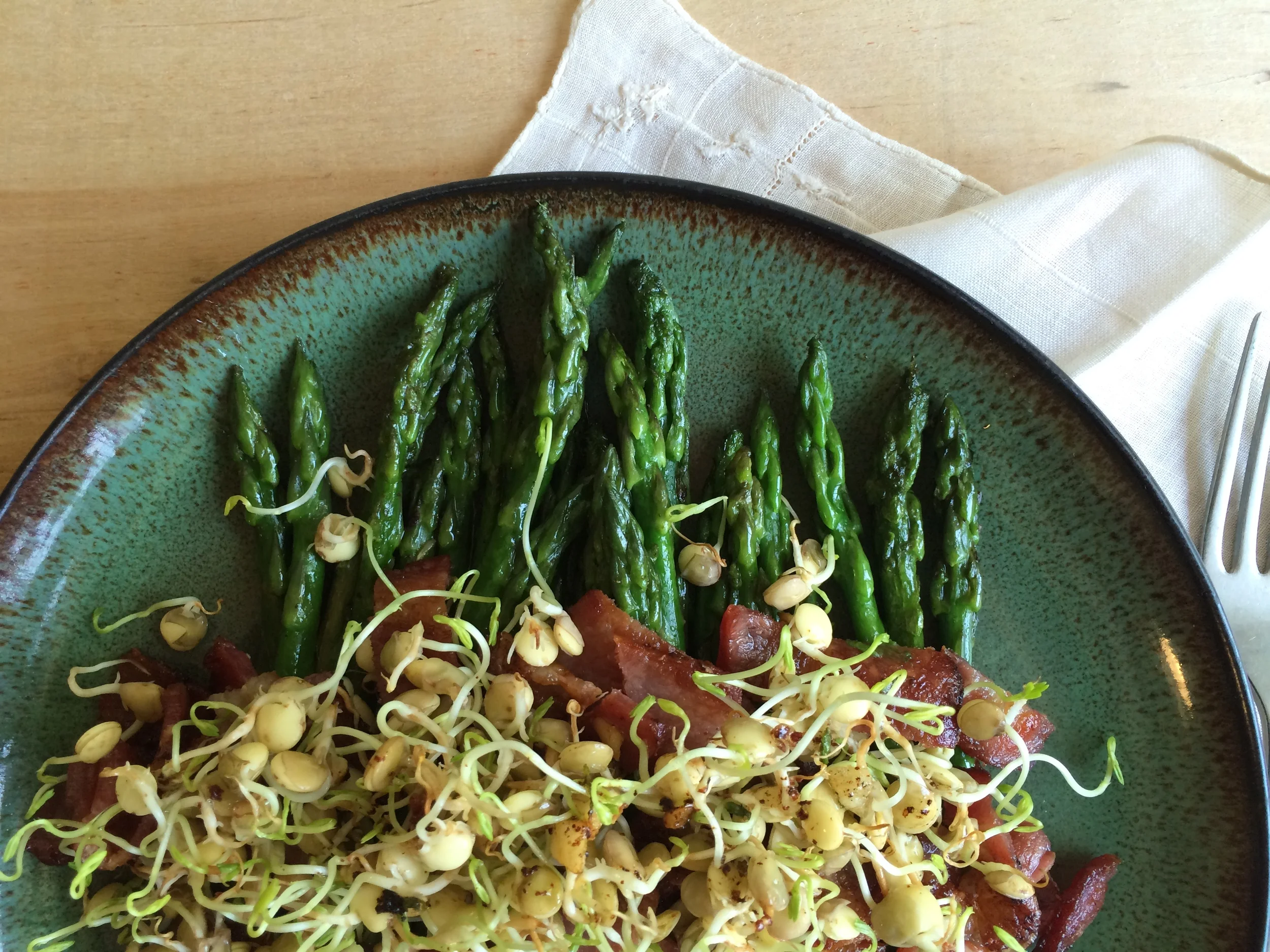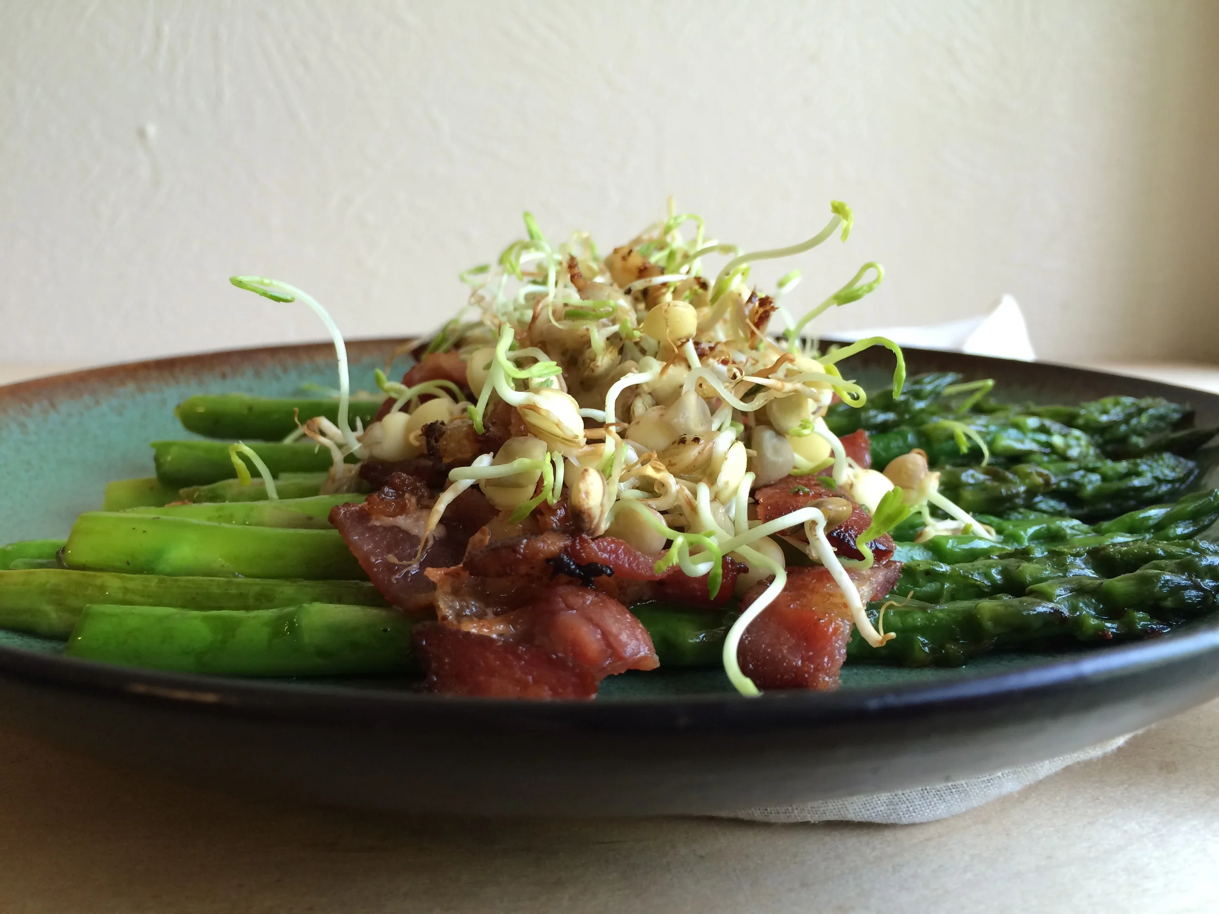 - Place the cooked asparagus on a plate, top with the bacon, then top with the sprouted lentils.