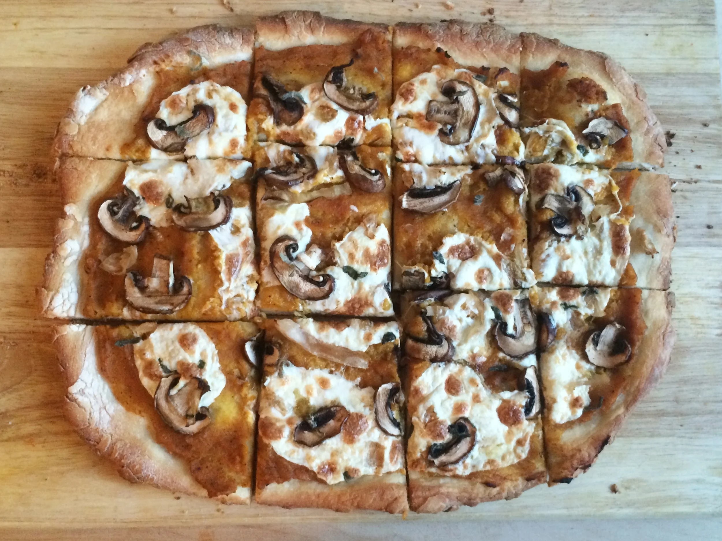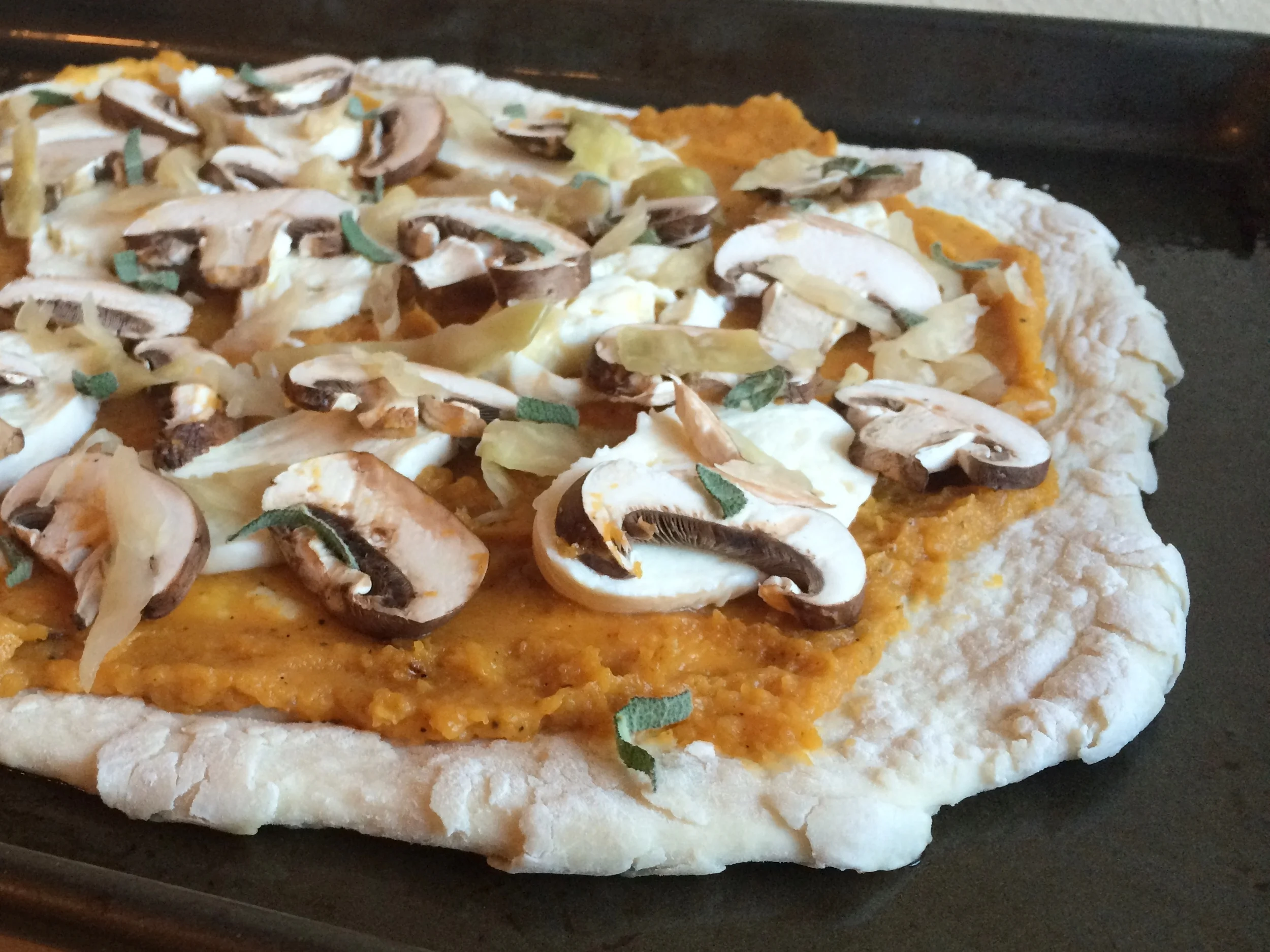 5. Dust a clean surface with flour and roll out the pizza dough. Place the dough on a baking sheet. Spread the butternut squash puree over the pizza dough, leaving a 1/2 inch edge.