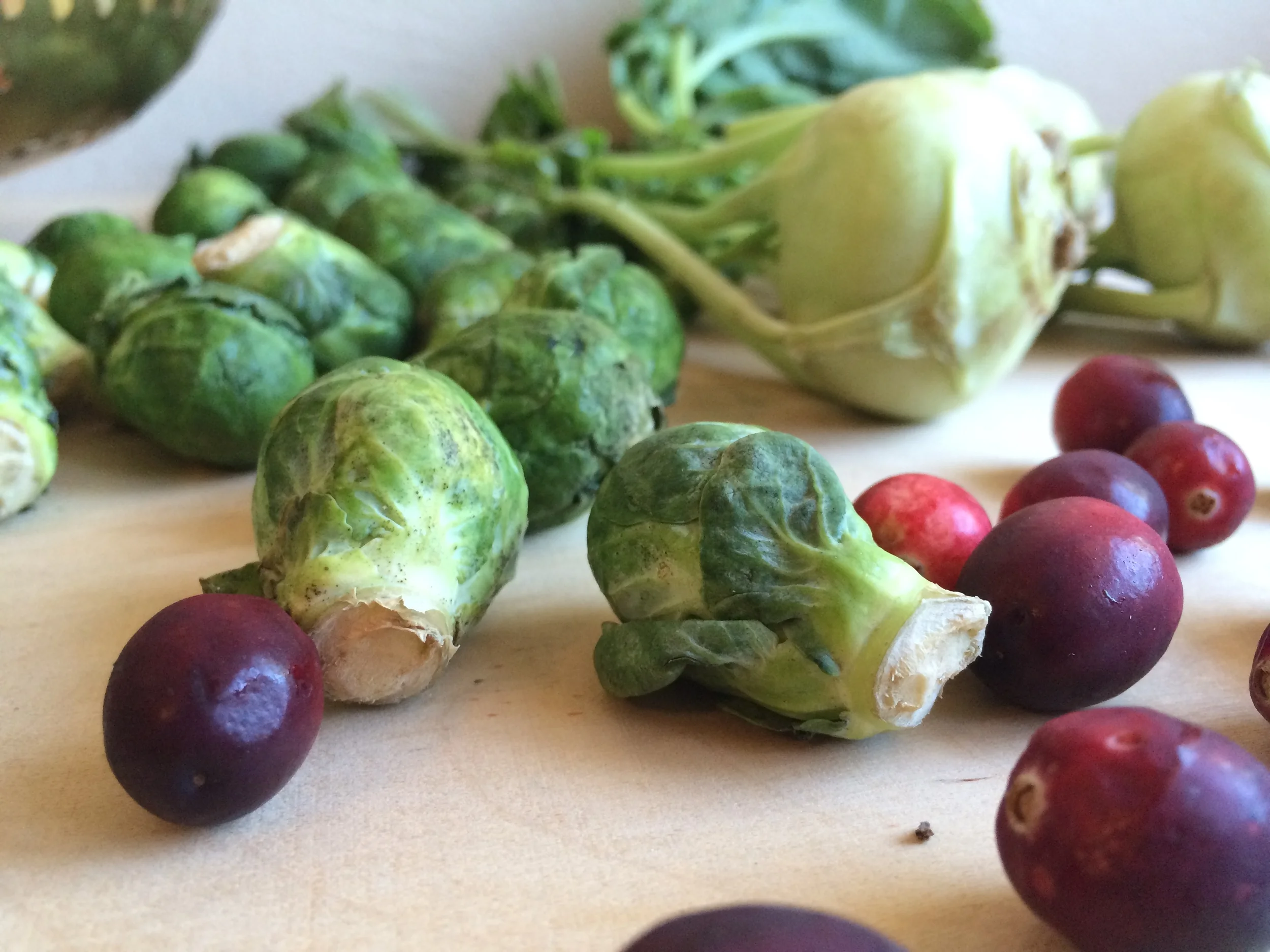 3. Cut the bottom stems off the Brussels Sprouts and shred with a mandolin or slice thinly with a knife. Repeat with the kohlrabi, apples, and cranberries. Add sliced ingredients to kale and toss to combine.