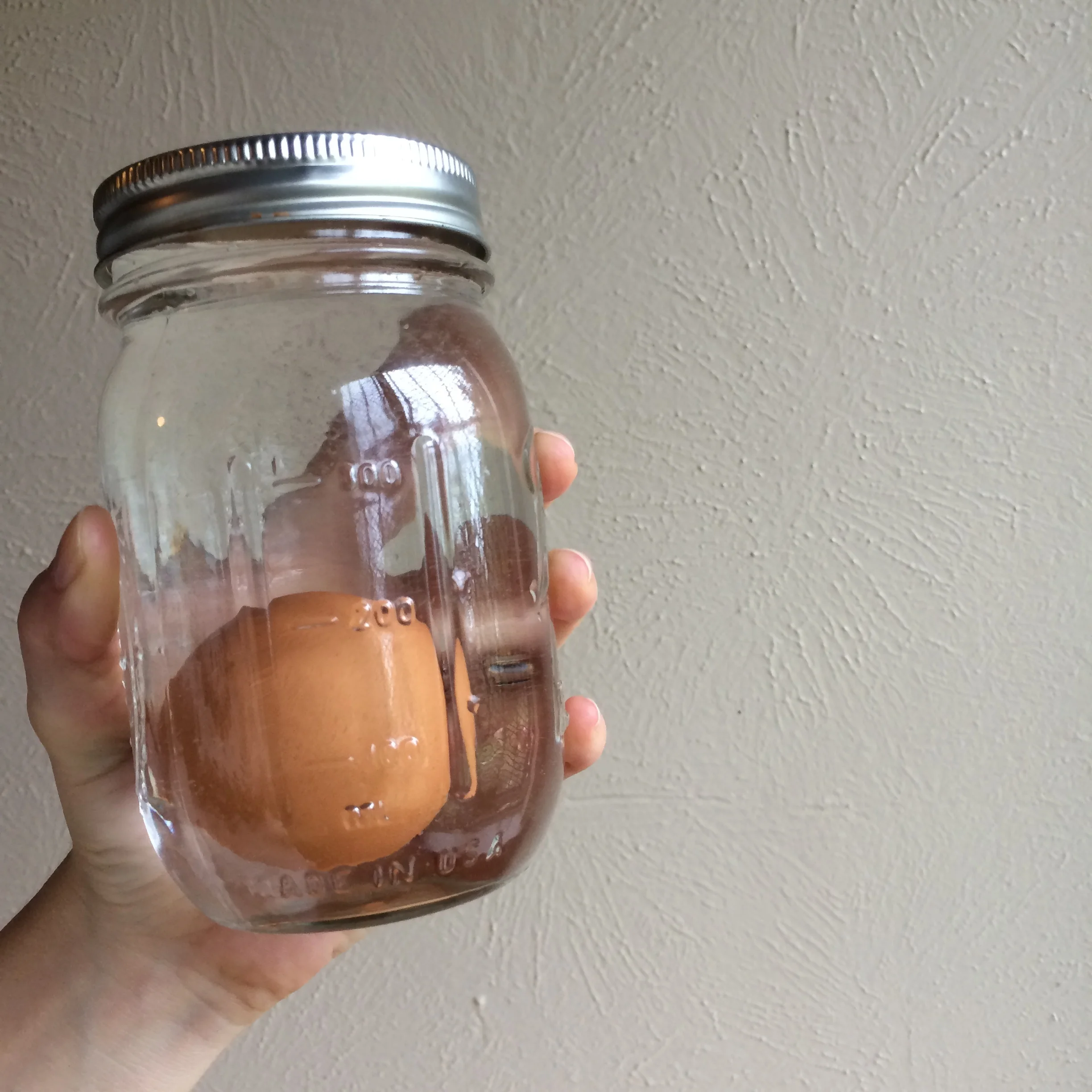 Place your boiled egg in a small jar. Choose a size where the egg can move around, but there shouldn't be more than an inch of space between the egg and the sides of the jar.
