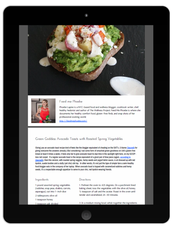 Each recipe gets a two page spread, one side has a big recipe photo and the blogger’s bio. The other side has the recipe in plain black and white text for easy printing.