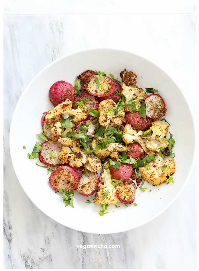 Try roasted cauliflower and radishes with mustard, nigella, and fennel seeds from Vegan Richa.