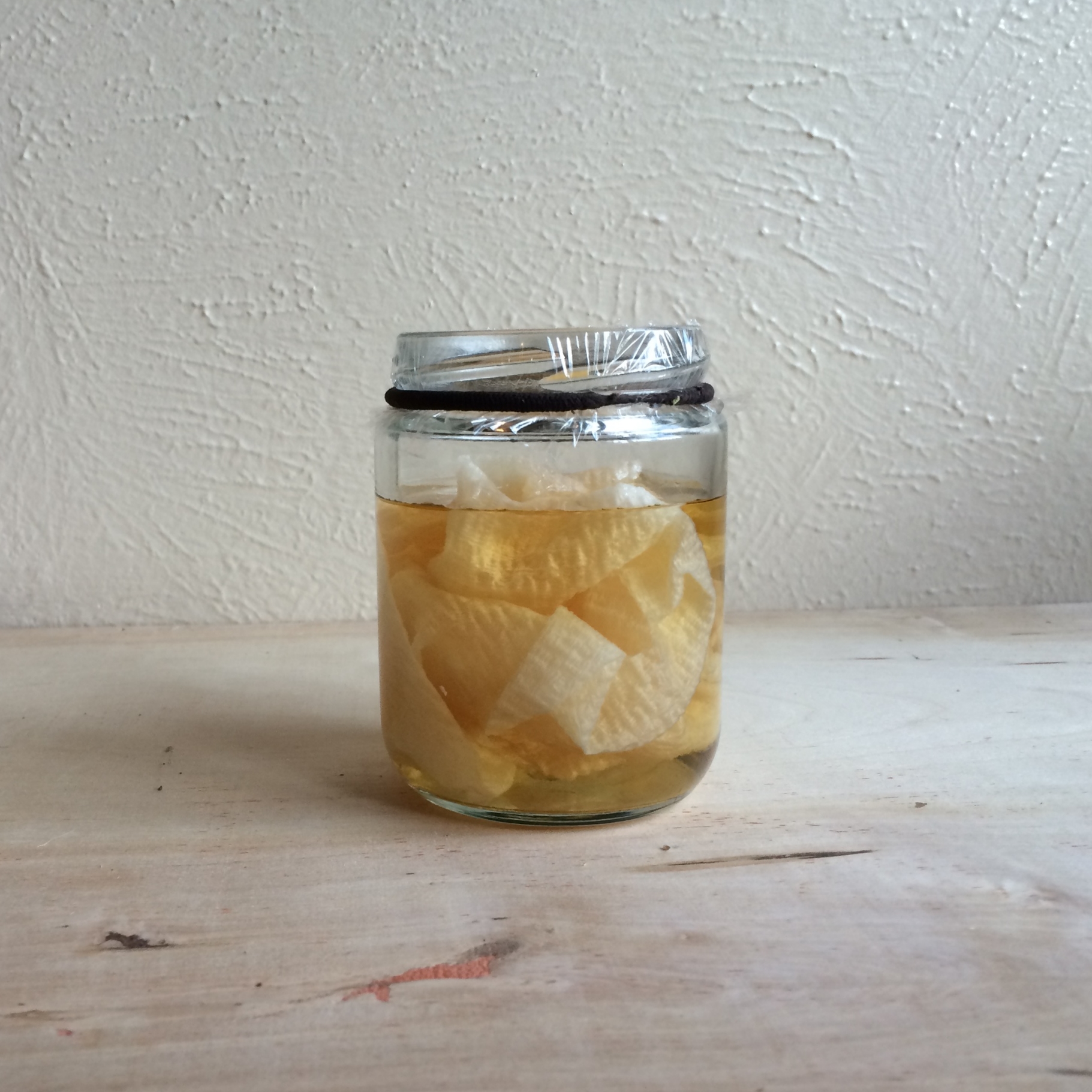 Super simple trap #2 - pour a little vinegar or wine into a glass jar. A standard mason jar is a good size, not too short, not too wide. Roll a piece of paper cross ways into a funnel shape and place it in the jar. Make the funnel just small enough that it’ll expand slightly to fit the width of the jar.