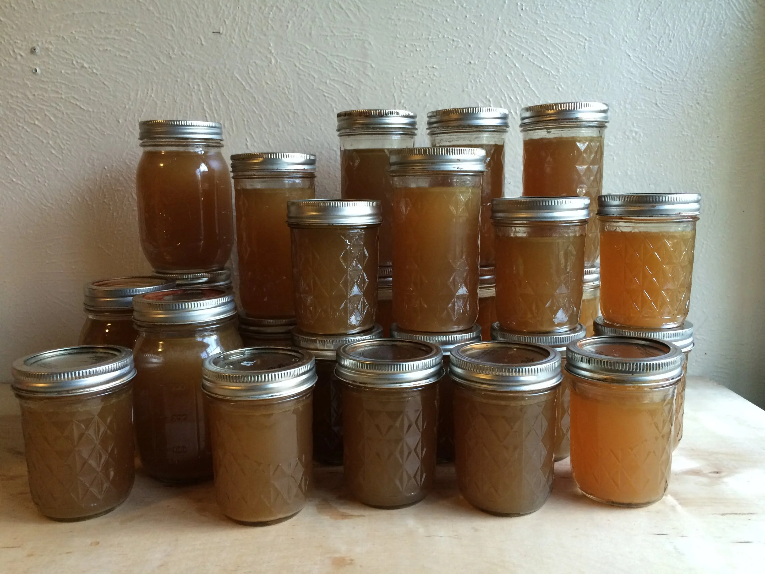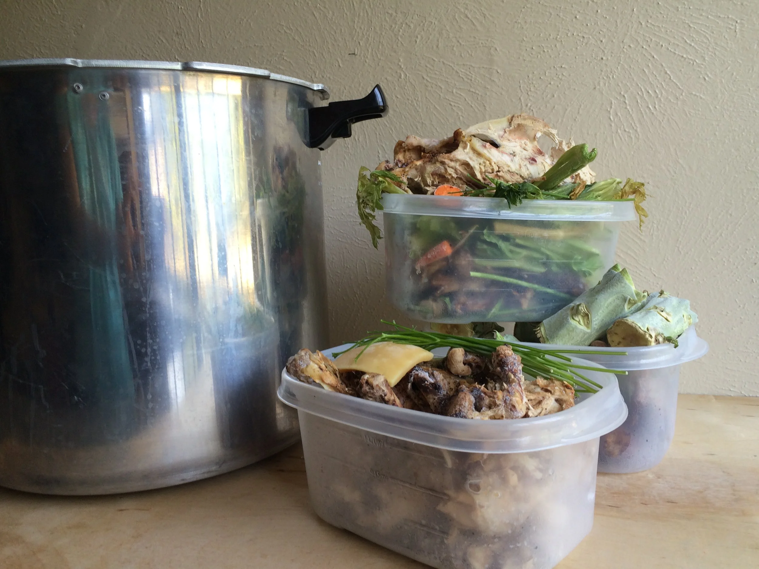I’ve got chicken bones. I get some excellent chicken leg quarters (the chicken leg and the thigh still attached together) from the farmer’s market. As we eat them, I toss the bones in the freezer until I have enough to do a big stock!